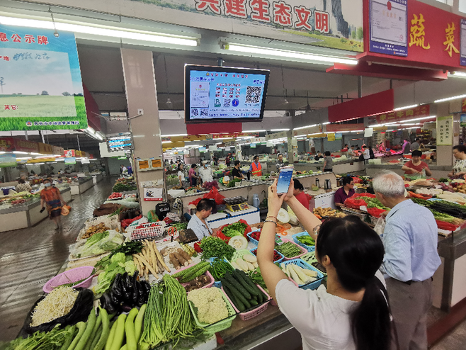 今年7月份以来,天长市作为“满意消费长三角”行动安徽省唯一的示范城市,着力探索建设智慧化农贸市场,在千秋乐市场改造升级中更多融入科技元素,每个摊位上安装电子显示屏,一户一屏、一屏多码,实时滚动显示摊主的营业执照、商家承诺、菜品参考价格等各类信息,进一步提升明白消费工程。显示屏上的食品溯源、投诉举报、智能支付三类二维码成了智慧化农贸市场的最大看点。消费者只需手机扫一扫,不仅可以实现快捷支付,当天销售的各类食用农产品的产地、生产者、联系方式、检测结果、农药残留等信息也能一览无遗。