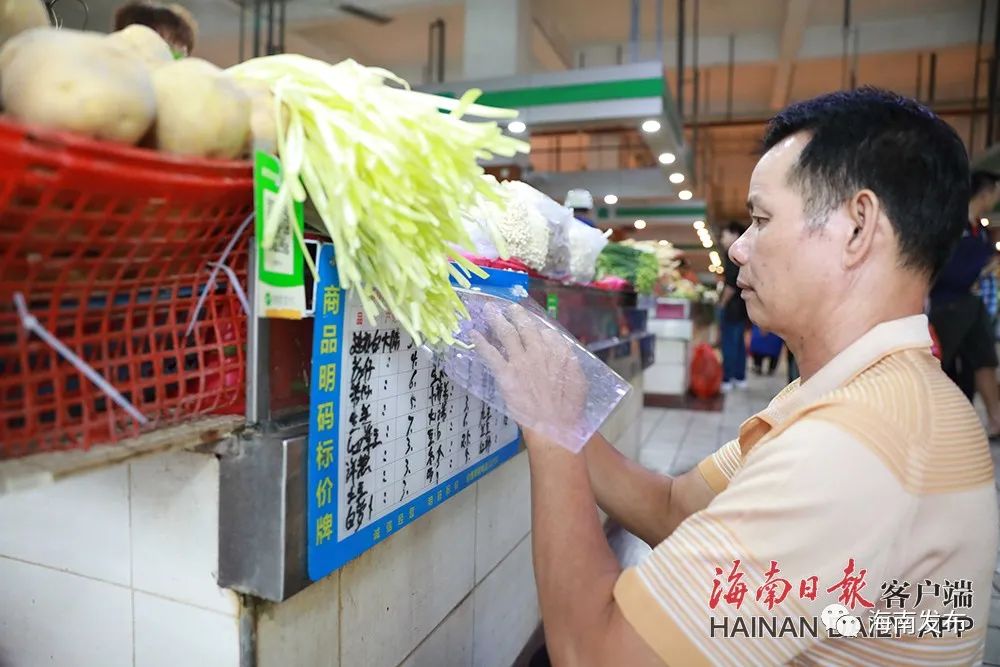 10月18日,在海口城金农贸市场,摊主更新当日蔬菜价格。