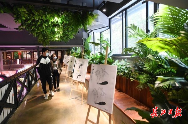 二楼文化长廊绿植环绕的漫画展。