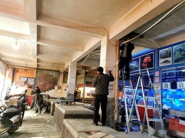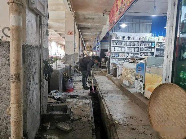 11月14日,记者在现场看到,八角亭农贸市场内提升改造工程紧锣密鼓进行中,工人们正在进行下水道改造和摊位、墙壁的装修装饰。