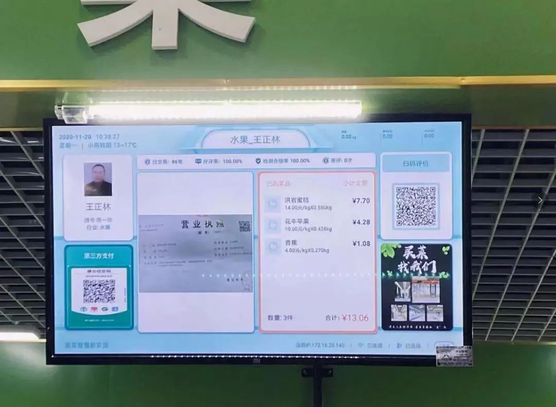 市场最大亮点是建设智慧农贸系统。在市农业银行的大力支持下,市场引入了先进的冲谷麦菜智慧农贸管理系统,为商户配备电子追溯秤、显示屏,构建了市场信息化管理平台、展示触摸查询平台、数据采集及智慧支付平台、食品安全监管与追溯平台、社区O2O电子商务平台等智慧化系统,实现了市场经营农产品的“来源可追溯、去向可跟踪”,守护百姓餐桌健康。