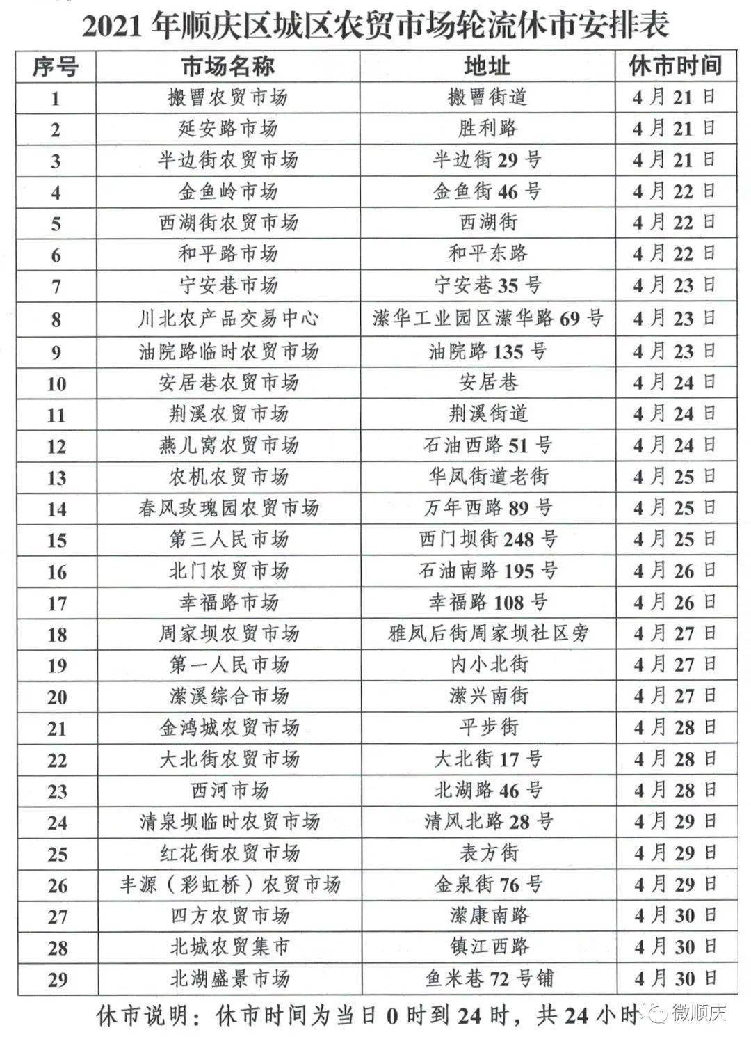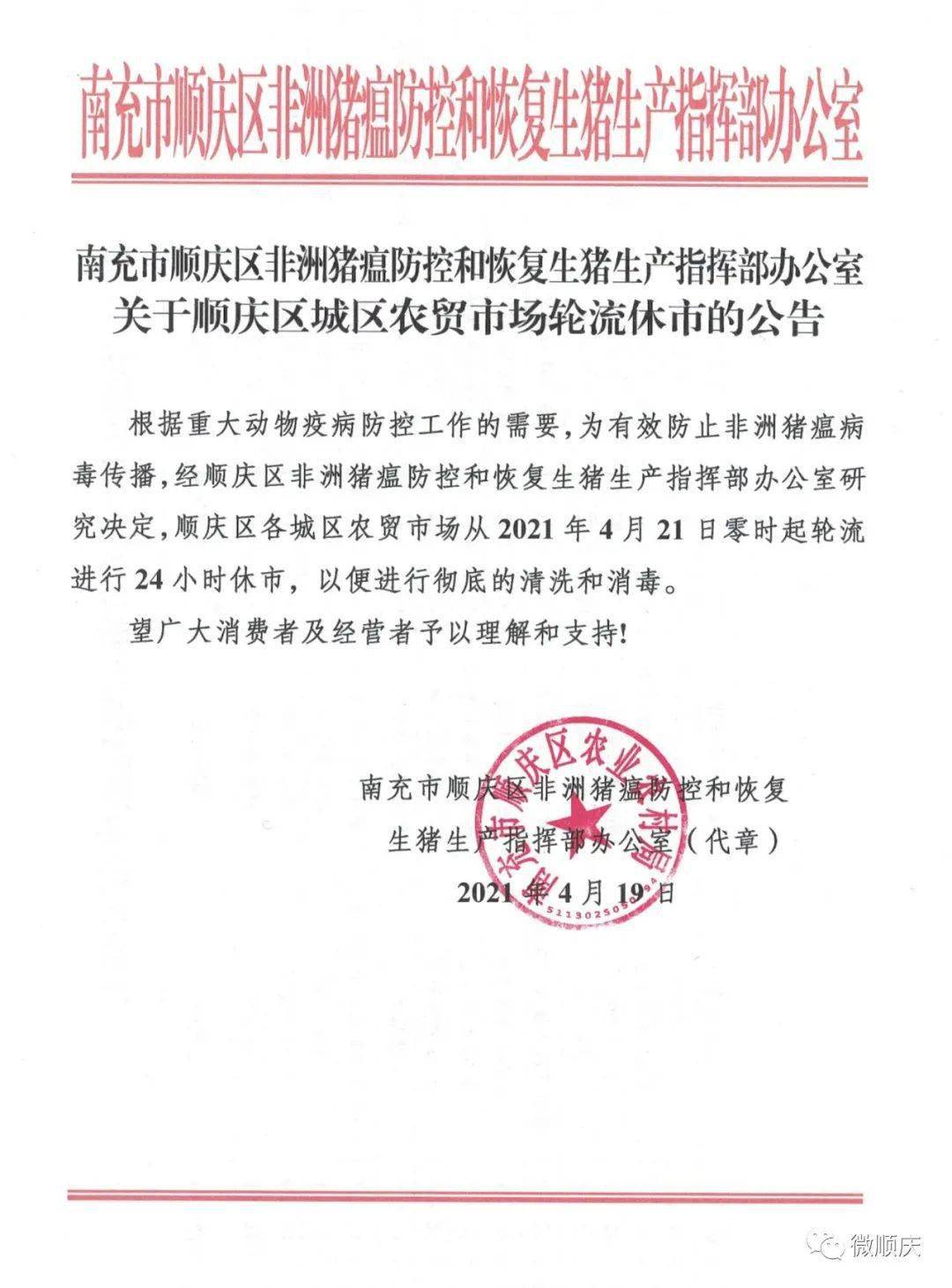根据重大动物疫病防控工作的需要,为有效防止非洲猪瘟病毒传播,经顺庆区非洲猪瘟防控和恢复生猪生产指挥部办公室研究决定, 顺庆区各城区农贸市场从2021年4月21日零时起轮流进行24小时休市, 以便进行彻底的清洗和消毒。
