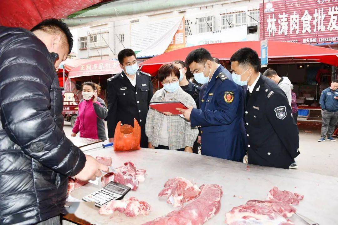 “麻烦把猪肉‘两证一报告’拿给我们看看。”早上6点的城北农贸市场人群熙攘,在肉食摊位前,执法人员严格按照《食品安全法》《生猪屠宰管理条例》及非洲猪瘟防控要求,对动物检疫合格证明、肉品品质检验合格证、定点屠宰印章和检疫验乞印章、非洲猪瘟病毒检测报告等进行了重点检查,严格杜绝白条肉、来源不明或不合格的生鲜猪肉流入市场。