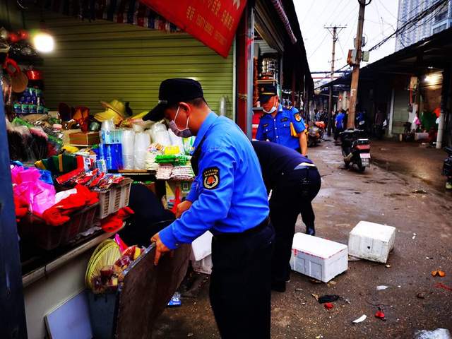 12日清晨5点30分,蔡甸街道办事处与区城管局120名城管执法队员,在建新市场协助店铺商贩将店外经营物品清理干净,制止流动摊点,对乱撑遮阳伞和在店外悬挂物品等行为进行劝导纠正。针对非机动车辆乱停放、摊点乱设、占道经营等现象,每天安排专人值守,实行“定人定岗”,加强全天候市容秩序管理。