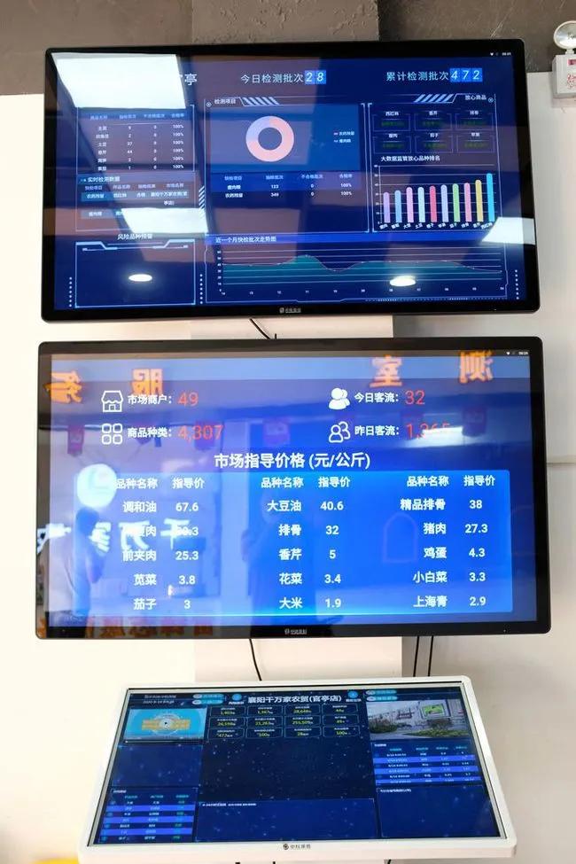 这家菜市场的过人之处,除了环境之外,还有它的智慧化程度。在市场大门口设置有三块电子屏,市场的人流量信息,发改委每日的菜价等都会进行公示。