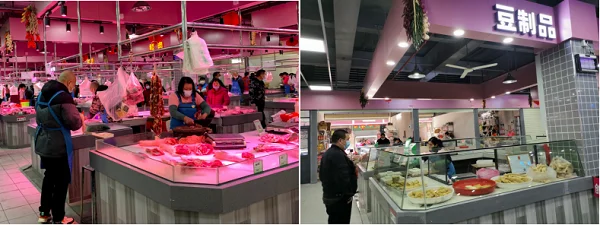 改造后的新东市场焕然一新,数百个摊位按鲜、活、生、熟、干、湿等区域划分,井然有序地陈列着各自的货品;电子屏上滚动呈现着菜场的各种类目商品的经营情况、菜品价格、农药残留检测结果等信息;整齐划一的设计、宽敞明亮的布局,充满活力的色彩与其说这里是菜市场,不如说这里是“一半是烟火,一半是海洋”的沉浸式消费“时尚超市”。