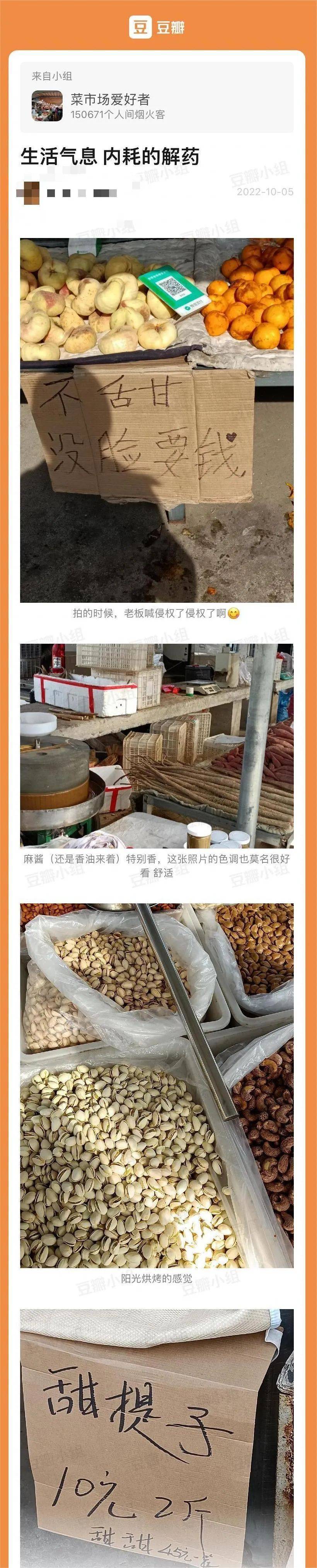在微博,在豆瓣上,有不少人因为疫情没有太多机会外出游玩,索性开始认真生活——学着像妈妈那样,趁着周末,去菜市场挑一挑好食材,顺便感受一下人间烟火气。于是,就诞生了自发的菜市场文学交流小组。有人坚持发布自己在菜市场看到的令人捧腹的摊主文案,和评论区打成一片。