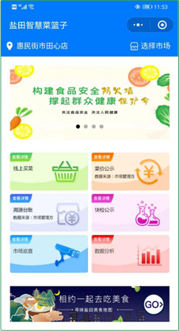 盐田区智慧菜篮子以数字化赋能,由市场监管部门督查监管,通过在农贸市场档位上安装视频监控、接入智慧计量数据,引入市场检测数据,汇总智慧化数据和视频,形成农贸市场运行监测大数据平台。让档铺可看,菜品可查,菜源可溯,解决现有商业买菜平台看图下单、不可溯源、菜价不一、质量问题等困境。让市民通过盐田智慧菜篮子小程序足不出户就可轻松掌握盐田农贸市场菜篮子供应情况和食品安全资讯,享受线上逛市场买菜;让经营者受到随时的监督,同时紧跟电商时代步伐,使“烟火气”通过互联网连接千家万户。